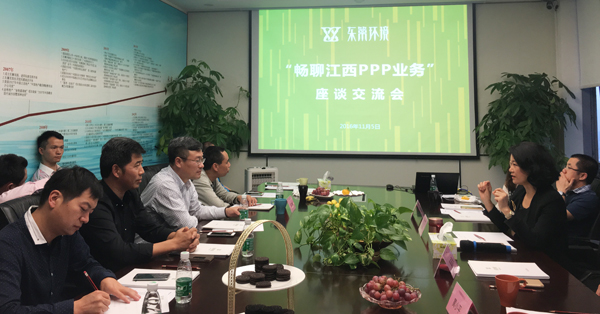 11月5日下午,由广东东篱环境股份有限公司承办的广东省江西商会第五期会长轮值会如期举行。在商会副会长、东篱环境徐玲董事长组织下,广东省江西商会高级顾问郭庆伟、广东省工商联李汉峰秘书长、江西省南昌县委常委陈伟峰一行以及商会曾建宁副会长等多位商会成员齐聚一堂,展开了一场以“畅聊江西PPP业务”为主题的座谈交流会。