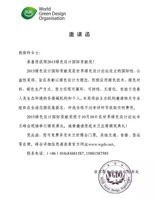 金秋十月,在这收获满满的季节,“2015世界绿色设计论坛”邀请函悄然而至,意料之外又在情理之中,毕竟能够得到世界绿色设计组织的认可,我心情还是有点小激动,尤其是能够在四大文化发源地近距离感受古罗马文化,作为中国文化的一名使者,我热切期盼通过这个国际平台更好地推广绿色设计理念,同时汲取更多来自世界各国的创新理念与精华,共同推动世界绿色建设的发展。