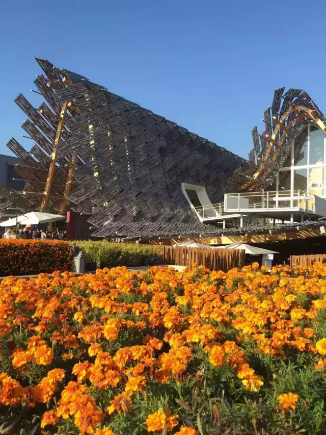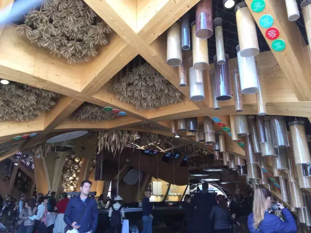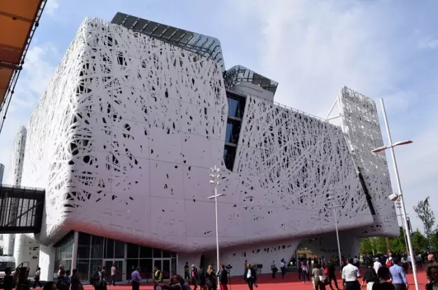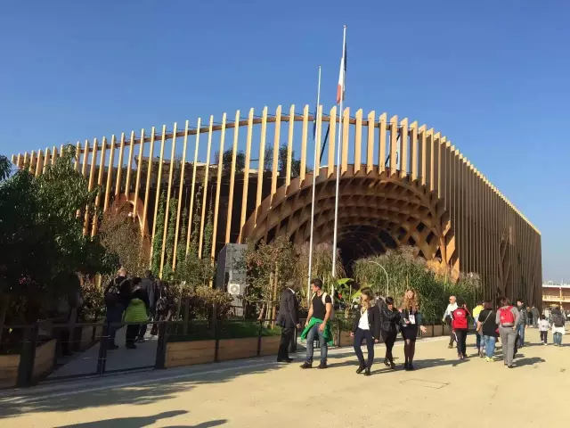 法国馆占地3600平方,采用轻质的木结构打造一个可以重复使用的凉亭,以减少能源消耗,倡导能源的可再生利用。以“上下颠倒”的方式向游客展示法国生活、法国制造、法国味道。火腿、酒、面条、还有各种烹饪用具都在头顶上,与建筑紧密联结在一起,种植在馆内天花板及其四周的农作物,大多为易生长的产物。