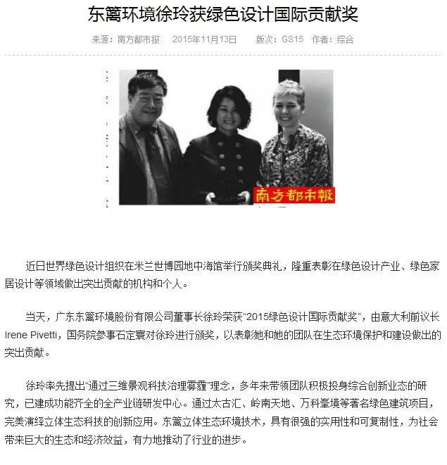 东篱环境董事长徐玲女士荣获世界绿色设计组织最高奖项“2015绿色设计国际贡献奖”,这是来自世界专业组织的肯定与高度赞赏,受各界媒体高度关注,荣登11月13日南方都市报专版。东篱将不断努力前行,实现更大的创新突破,为社会带来更大的生态和经济效益,推动行业的进步,为全球绿色生态可持续发展做出更大的贡献。