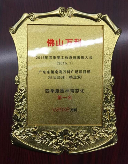 精细赢品质,创新结硕果!万科峯境项目,东篱环境凭借着创新的立体生态科技技术,首创“立体式园林绿化社区”,也荣获“2015年全国园林绿化优质金奖工程”、“2015金盘奖华南赛区年度最佳住宅奖与住宅类年度媒体推荐奖”等诸多荣誉。近日,由东篱环境承建的南海万科广场项目再创万科项目评比第一的佳绩,荣获万科集团“2015年四季度园林常态化第一名”,同时也在万科集团2015年广深区域工程交付评估中赢得“优秀项目奖”。