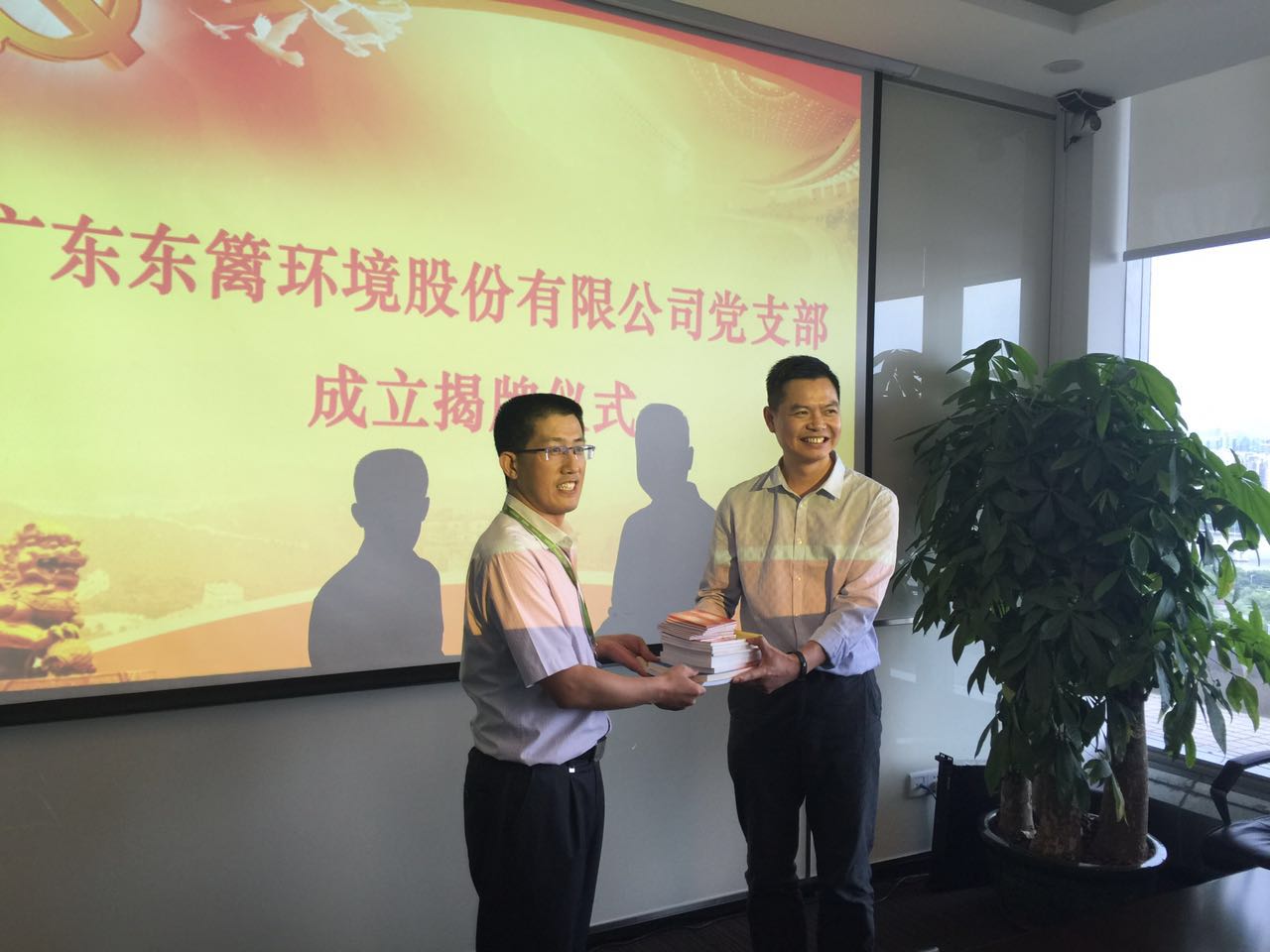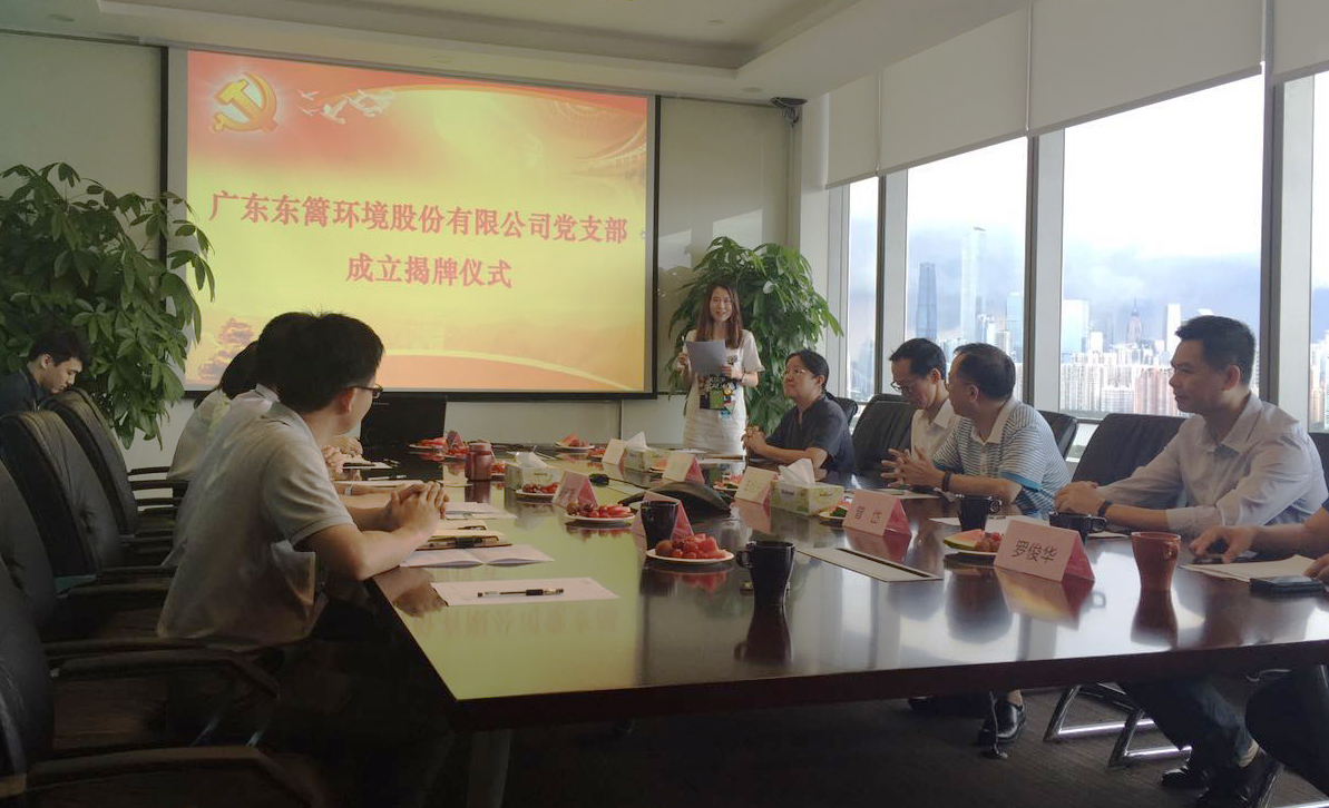 2016年7月1日,喜逢中国共产党95华诞,广东东篱环境股份有限公司举行党支部成立揭牌仪式。天河中央商务区管委会企业服务处处长陶小民同志、天河区商务和金融工作局总经济师于卫宁同志、天河南街党工委书记王旭光同志、人大天河南街道工委副主任曾岱同志,广东东篱环境股份有限公司董事长徐玲同志及党支部全体党员、入党积极分子、职工代表等参加挂牌仪式。