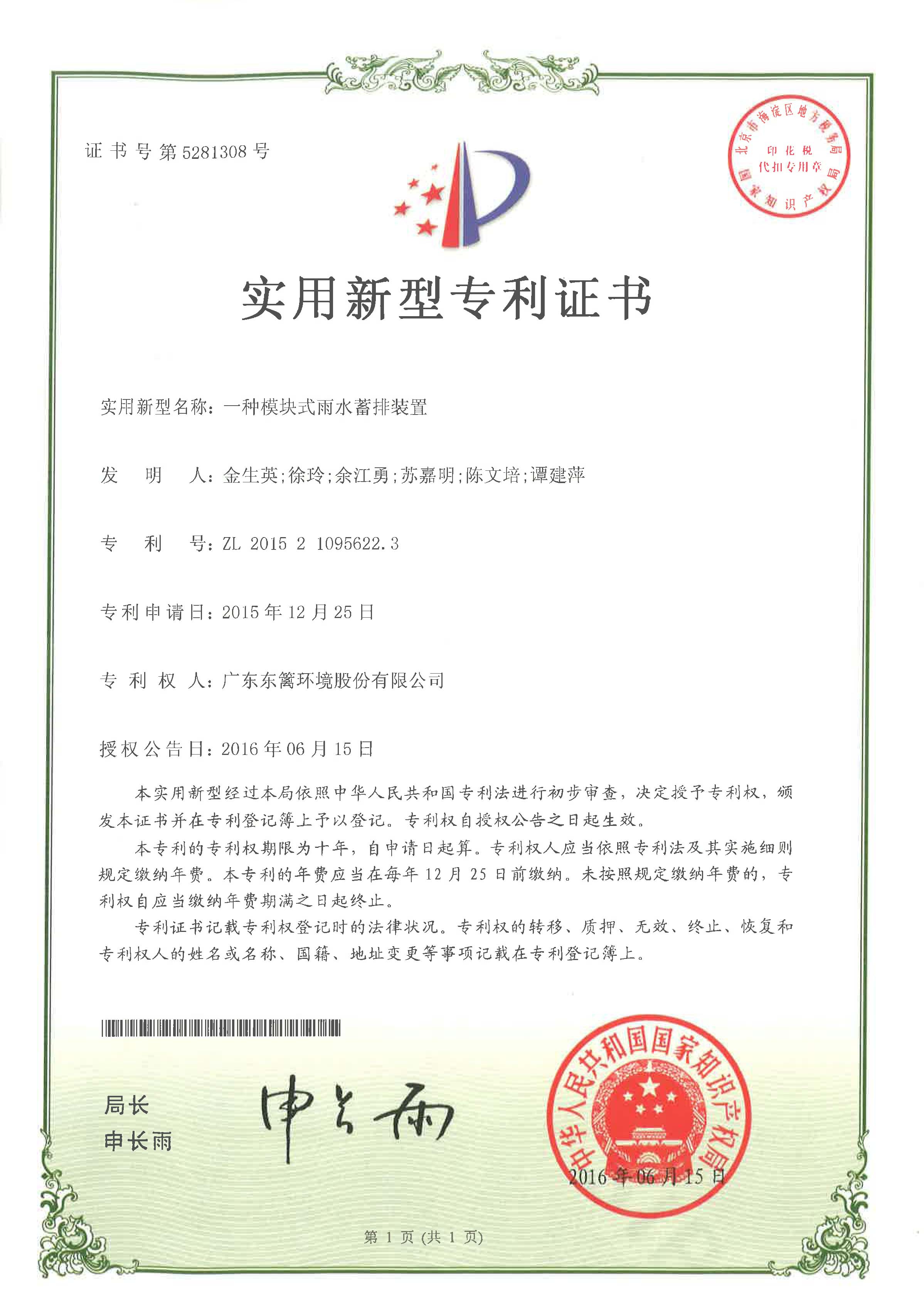 【东篱荣誉】模块式雨水蓄排装置获实用新型专利证书!