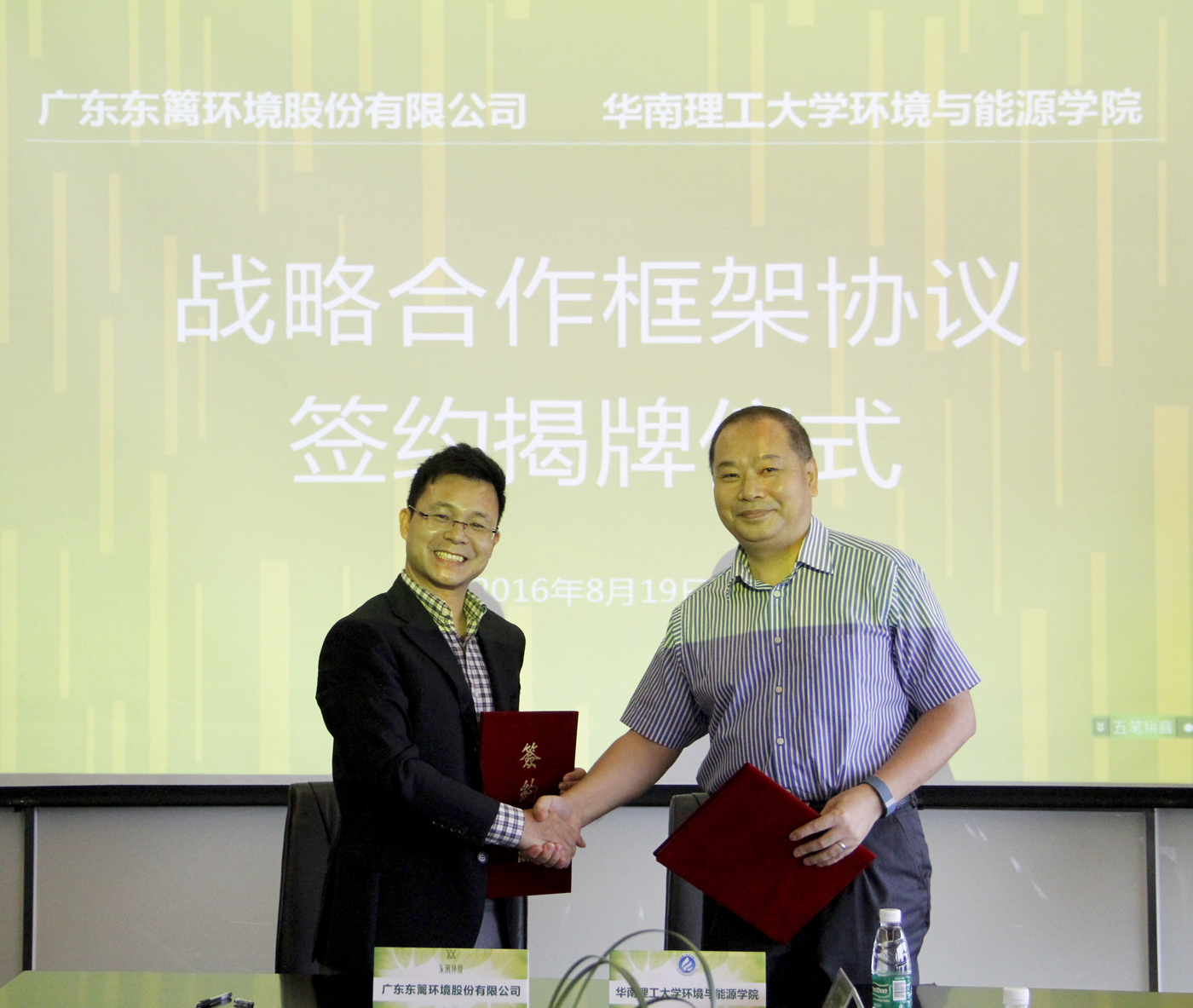 ▲东篱环境许杰雄总裁(左)与环境与能源学院胡勇有教授(右)签署协议。